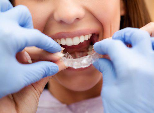 Ao colocar o aparelho pressione-o com os dedos polegares na arcada superior e com os dedos indicadores na arcada inferior para que fique bem adaptado.